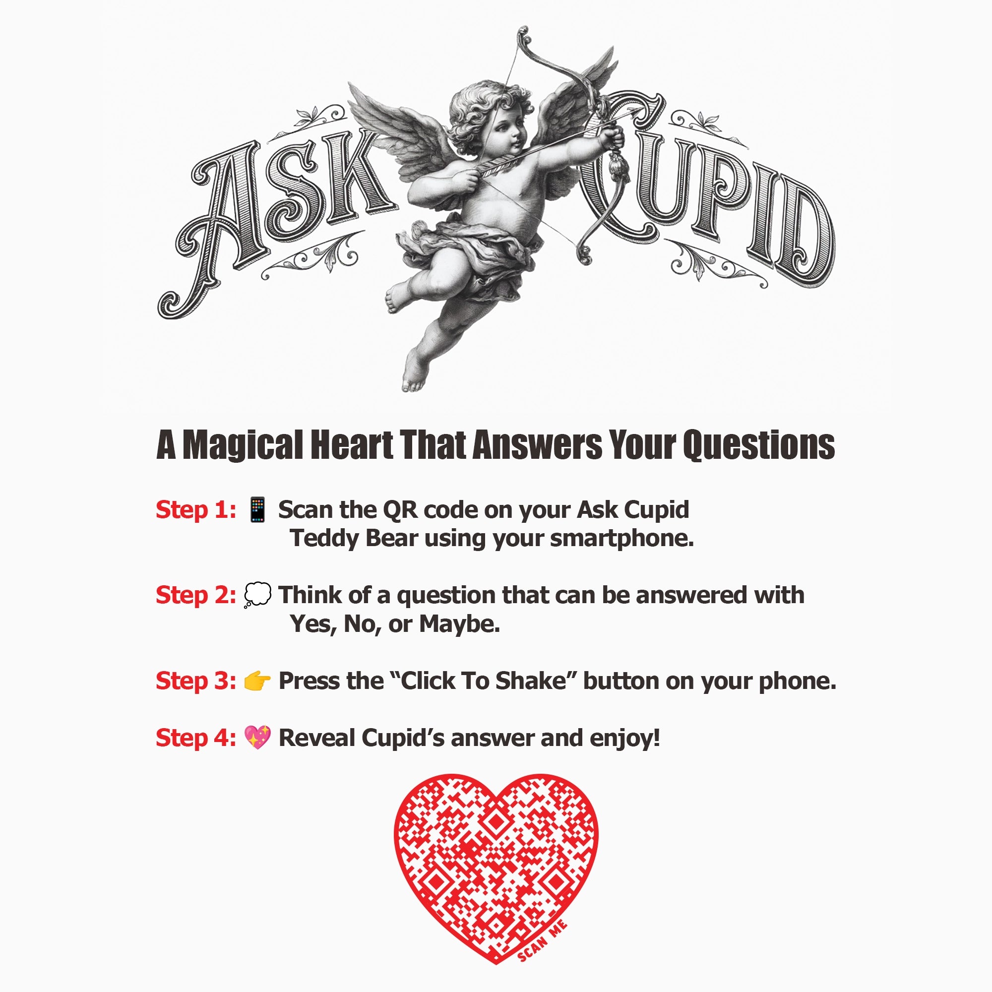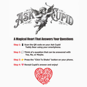 Using the Ask Cupid™ shirt is simple and fun. Just think of a question, then invite someone to scan the heart QR code on the back with their smartphone. Instantly, Cupid reveals an answer—Yes, No, or Maybe—making every scan a surprising and memorable moment. No apps, buttons, or setup required—just scan and see what Cupid says.