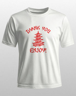 A simple message, a timeless symbol, and a little bit of magic. The Thank You Enjoy Tee captures the nostalgic charm of classic takeout packaging with a bold pagoda graphic and a phrase that feels instantly familiar — comforting, playful, and quietly iconic. Clean lines and bright red artwork give this design a graphic punch that’s both minimal and meaningful, blending everyday style with cultural storytelling.