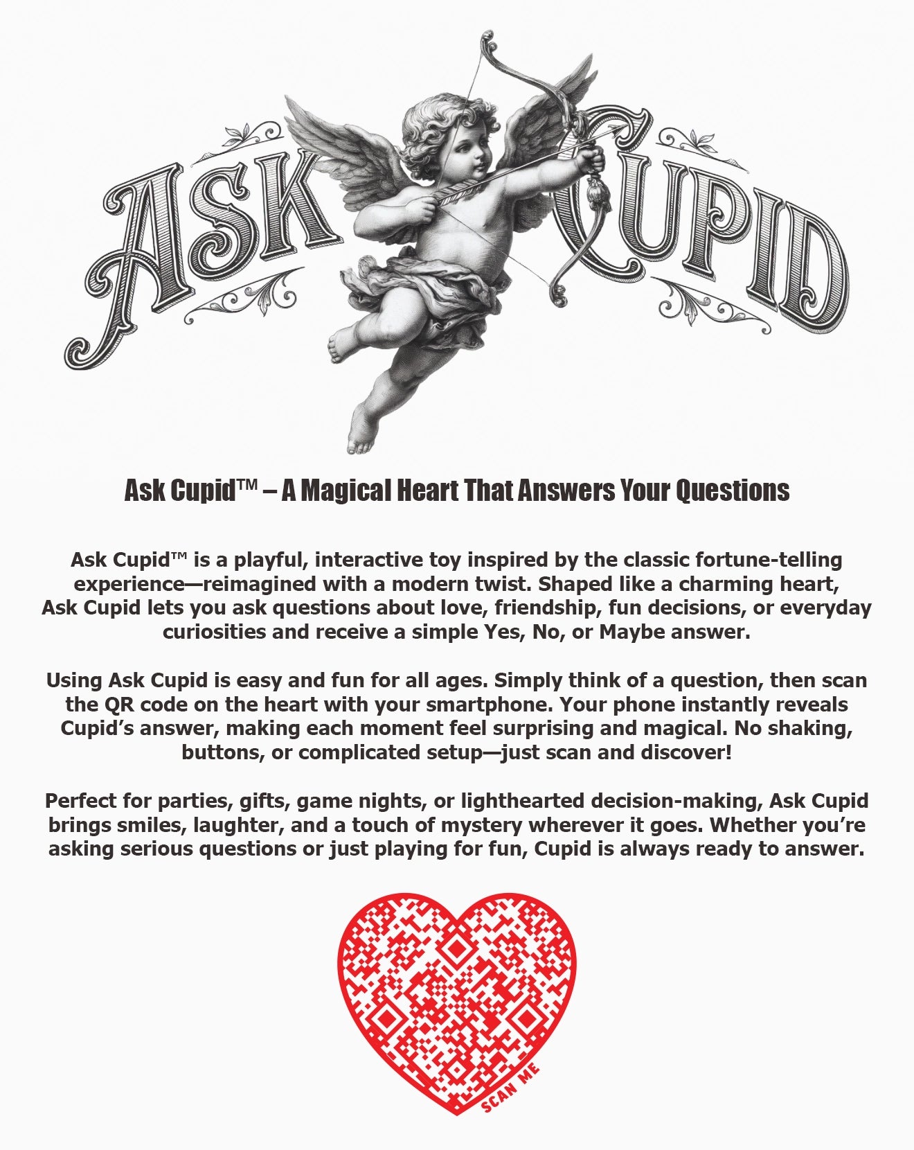 Using Ask Cupid is easy and fun for all ages. Simply think of a question, then scan the QR code on the heart with your smartphone. Your phone instantly reveals Cupid's answer, making each moment feel surprising and magical. No shaking, buttons, or complicated setup—just scan and discover!